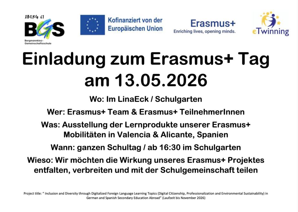 Am 13.05. laden wir Euch ein. Wir möchten Euch zeigen, was Erasmus+ alles bewirken kann, was wir bisher erlebt und erreicht haben. Kommt zahlreich. Wir freuen uns auf Euch.