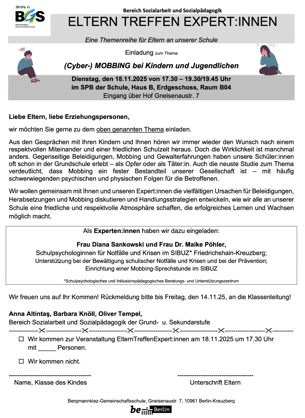Diesmal wird es um „(Cyber)Mobbing bei Kindern und Jugendlichen“ gehen. Gemeinsam mit Ihnen, den Eltern, sowie den eingeladenen Expertinnen aus dem SIBUZ wollen wir über die vielfältigen Ursachen für Beleidigungen, Herabsetzungen und Mobbing diskutieren und Handlungsstrategien entwickeln, wie wir alle an unserer Schule eine friedliche und respektvolle Atmosphäre schaffen, die erfolgreiches Lernen und Wachsen möglich macht. Genauere Informationen finden sich im Flyer. Anmeldung erwünscht.